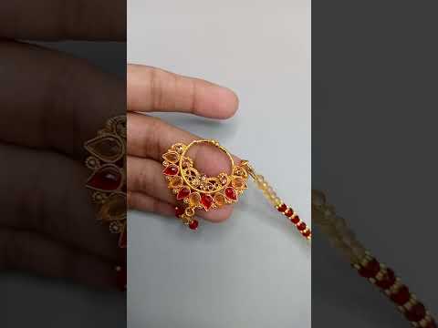 Product details Stylish Bridal non pericing red Nath With Cristal Chain Famous DiSine Long Lasting Polish For Beautyfull Girls.